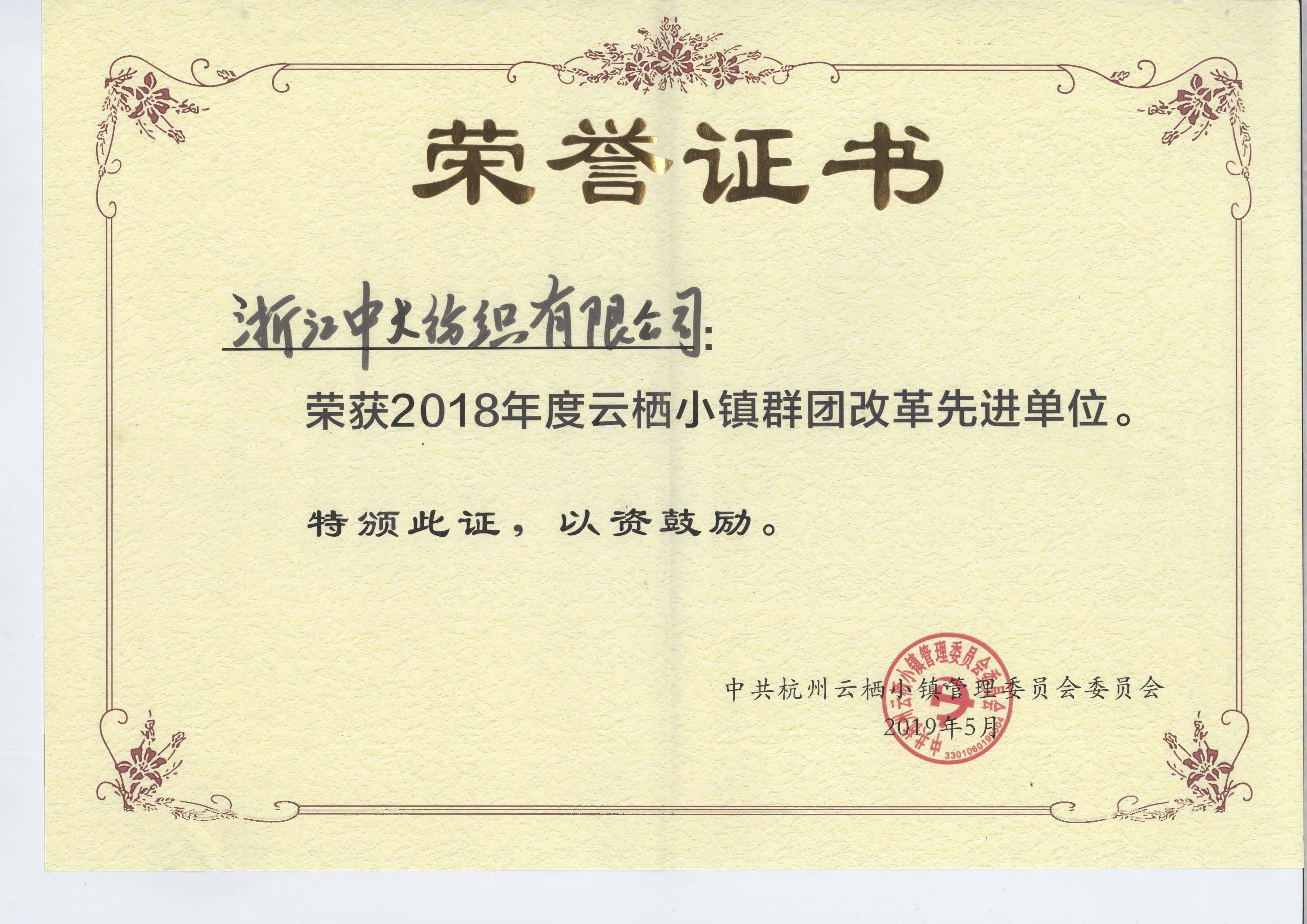 我公司作為2018年度云棲小鎮(zhèn)群團(tuán)改革先進(jìn)單位,受到表彰。